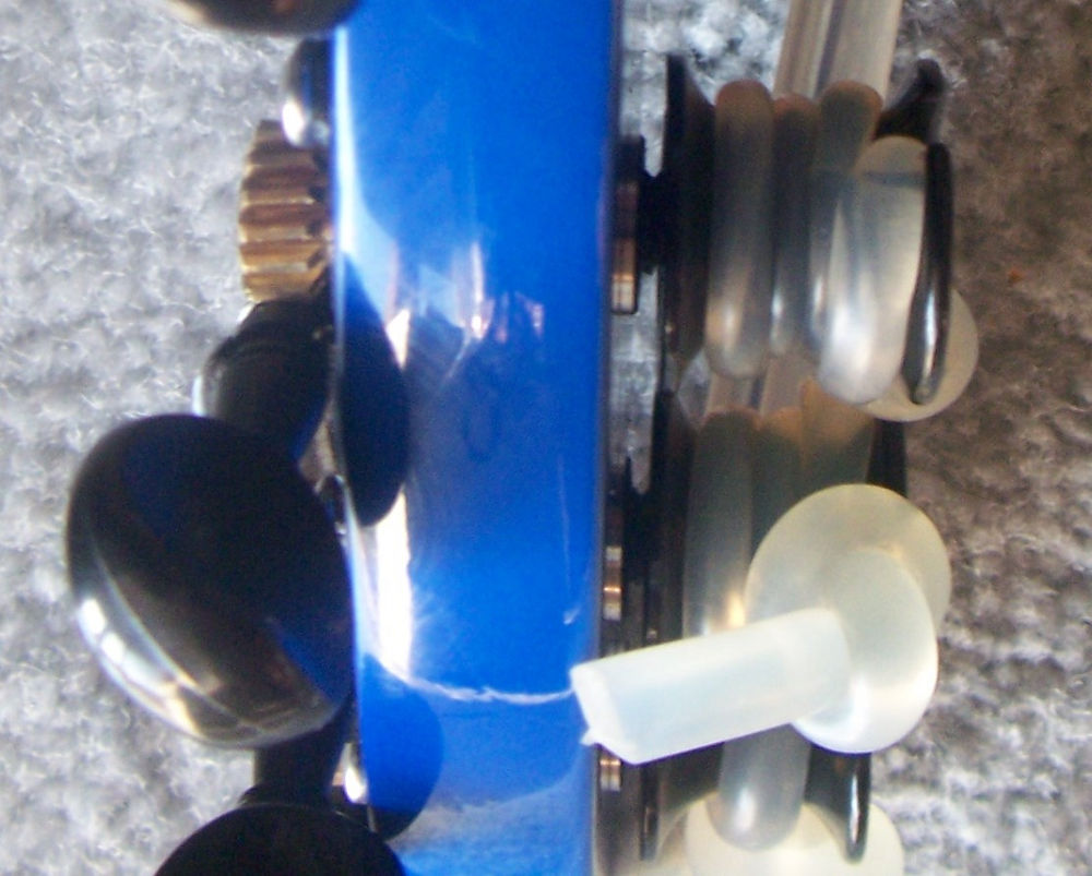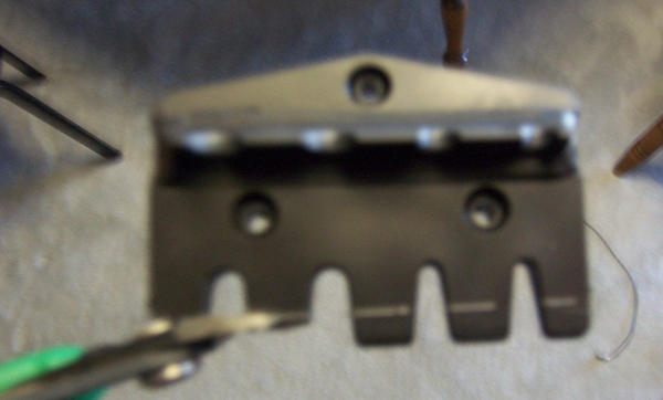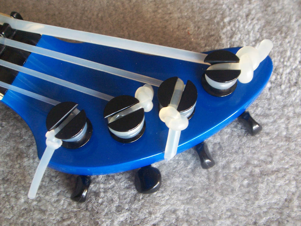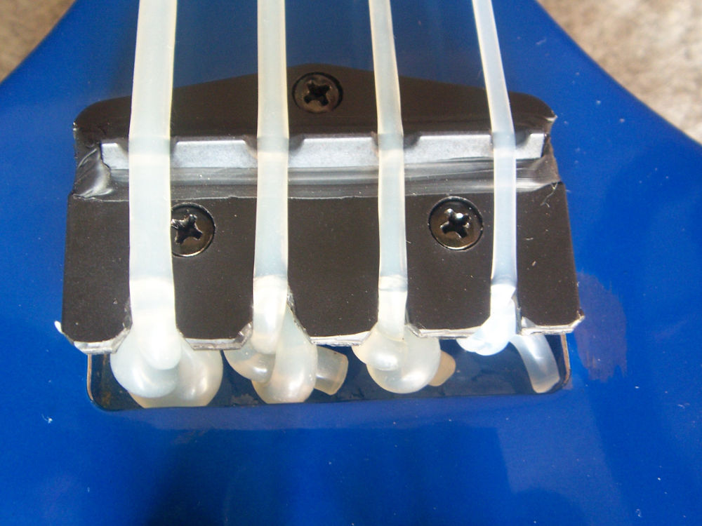 - Slots to hold strings are too long, almost covering the well that the knots sit inside. Although it was suggested to sand them down with a belt sander to shorten, I was uncomfortable with subjecting the new bridge to those sorts of vibrations. Solution: What I noted was that the bridge material is pretty soft plastic, which allowed me to simply clip them off with a good sharp side cutter and trim the edges with a razor blade.