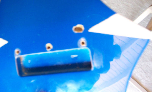 - Holes in headstock are further away from the edge. On the DeArmond, the tuner holes are noticeably closer to the edge and knobs stick out considerably. Solution: The knobs just clear the edge of the headstock. I selected an orientation where the knob shafts are not quite perpendicular to the edge of the headstock (see pic below). This gives a little bit more clearance to the knob. In the end, I kind of like the look of the smaller headstock, combined with the knobs not sticking so far out as on the DeArmond.