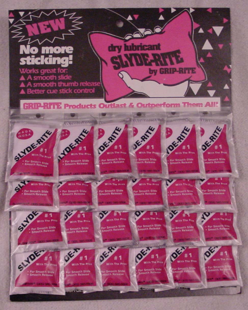 The problem with talcum powder is you can't just pick up some unscented, unmedicated stuff at a local discount store. It's either medicated or scented, and thus people generally go for baby powder for Ashbory use which is scented but works reasonably well and is readily available. Well, unlike some people, I really don't like the scented nature of the baby powder so most of my Ashbory playing time has been done without any dry lubricant. Unfortunately, there really are advantages to having the hands lighly dusted, so I decided to start a quest to find a powder that works like baby powder but doesn't smell. First I posted a message on the Large Sound community board asking what other people used. Some people used Baby Powder, someone else was using an oil of some sort, another person was using "a product called 'glove dust'" which is used inside high voltage (5,000 volt) rubber gloves. I decided to do some hunting. A local billiards store had these pouches behind the counter on a 24 count card called "Slyde-Rite". $2 each. "What the heck", I thought, so I bought one to try. Wow! The Slyde-Rite was very rewarding. Compared to baby powder, it: